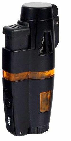 Hadson Machine Black szivar öngyújtó fekete, sárga színű gáztartállyal. Tetején egy zárófedél védi a szennyeződésektől a hármas szúrólángot, piezo gyújtással akár a nagyobb ...