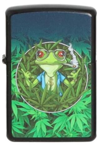 Angel Benzines vihargyújtó az elején marihuánásban spanglit szívó béka mintával. A fekete színű öngyújtó nemesacél házzal készült. A benzinnel tölthető öngyújtóval semmi más ...