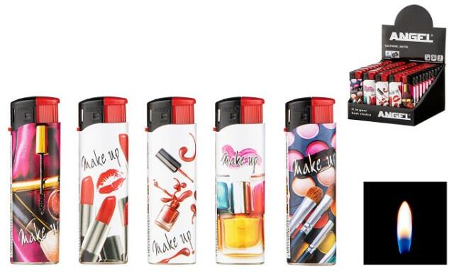 Angel márkájú színes öngyújtó, az elején smink kellékeket ábrázoló képekkel. Egész tálcás (50 db-os) kivitel. A gyújtó újratölthető, a láng állítható és ...