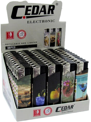 Cedar Elektromos Öngyújtó Koktélok mintával 50db-os kiszerelésben A "puha(soft) lángú" öngyújtó egy kényelmes és könnyen használható eszköz gyertyák, cigaretták és egyéb anyagok meggyújtásához. Úgy tervezték, hogy könnyű és hordozható legyen, lágy lángja pedig szellővé teszi a gyújtást. Kiváló minőségű anyagokból készült, tartós műanyag házzal és ké
