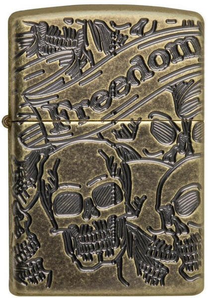 Zippo Armor® Freedom Skull Antique Brass 49035-000001 öngyújtó. Antik sárgaréz vésett koponya mintával MultiCut 360° garvírozással, különleges díszdobozban. Eredeti Zippo szélálló öngyújtó. Az összes fémszerkezet körülbelül 1,5-szer vastagabb, mint a normál Zippo tokban. Az öngyújtók töltetlen állapotban kerülnek forgalmazásra!