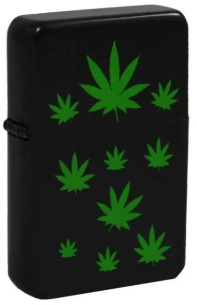 Újratölthető benzines öngyújtó kenderlevelek motívumával. Az öngyújtó mérete 37 x 55 x 13 mm, és a szállítási biztonság érdekében nincs megtöltve.