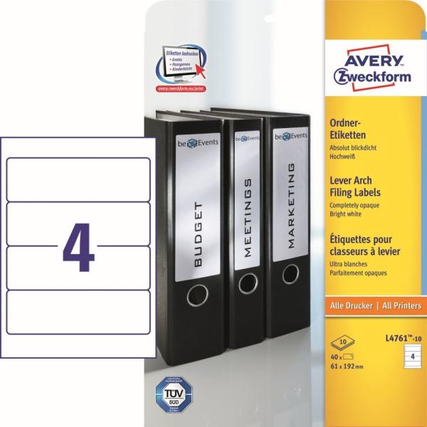 Címke mérete: 192 x 61 mm Avery Zweckform 192 x 61 mm méretű, fehér színű, matt felületű, univerzálisan nyomtatható, nagy fedőképességű öntapadós iratrendező címke, A4-es lapon, tartós tapadást biztosító ragasztóanyaggal, kerekített sarkokkal, valamint az új ultragrip technológiával, melynek köszönhetően a lapbehúzás rendkívül pontos, a nyomtatás pedig garantál