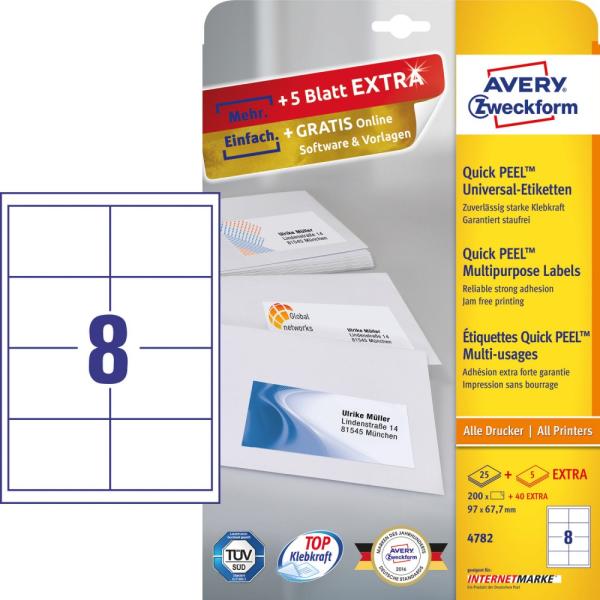 Címke mérete: 97 x 67,7 mm Avery Zweckform 97 x 67,7 mm méretű, fehér színű, matt felületű, univerzális öntapadós etikett címke, A4-es lapon, az eddigieknél erősebb tapadású ragasztóval, hegyes sarkokkal, az etikett címkék gyors leválasztását segítő QuickPEEL technológiával, valamint az új ultragrip technológiával, melynek köszönhetően a lapbehúzás rendkívül po