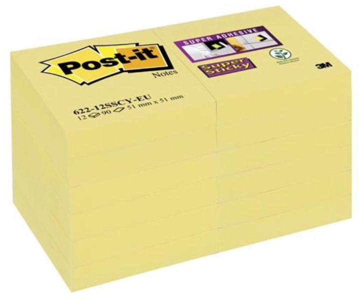 Öntapadó jegyzettömb csomag, 48x48 mm, 12x90 lap, 3M POSTIT Super Sticky, sárga (LP62212SSCYEU) erősebb tapadóképesség bármely durva felületen is megtapad 90 lap, 12 tömb 622-12SSCY-EU