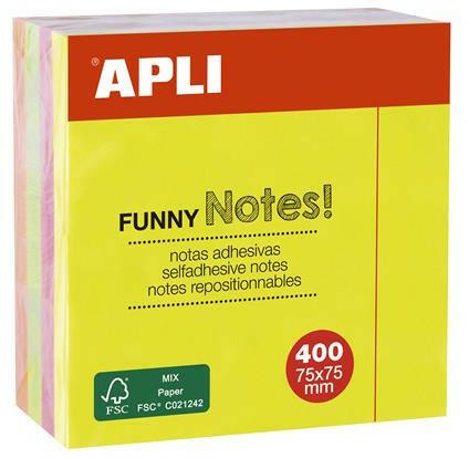 Öntapadó jegyzettömb, 75x75 mm, 400 lap, APLI "Funny", neon - ideális üzenethagyásra az irodában és otthon - 4 élénk neon szín: sárga, rózsaszín, zöld és narancs - megkapta az FSC (Felelős Erdőgazdálkodás Tanácsa) tanúsítványát, megfelel a környezettudatos gyártás követelményeinekAlcsoportöntapadó jegyzettömbMéret75x75 mmAnyagpapírSzínvegyesTípussimaForman orm