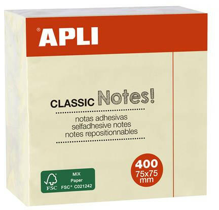 Öntapadó jegyzettömb, 75x75 mm, 400 lap, APLI "Classic", sárga - ideális üzenethagyásra az irodában és otthon - kiváló tapadás - klasszikus sárga színben - megkapta az FSC (Felelős Erdőgazdálkodás Tanácsa) tanúsítványát, megfelel a környezettudatos gyártás követelményeinekAlcsoportöntapadó jegyzettömbMéret75x75 mmAnyagpapírSzínsárga és árnyalataiTípussimaForma