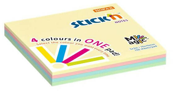 Öntapadó jegyzettömb, 76x76 mm, 100 lap, STICK N "Magic Pad" pasztell színek Egyedi, szabadalmaztatott technológiával készült Magic Pad öntapadó jegyzettömb -4 különálló pasztell szín tömbönként -bármelyik szín választható -igény szerint - az egyes színek külön leválaszthatóak -100 lap/tömb