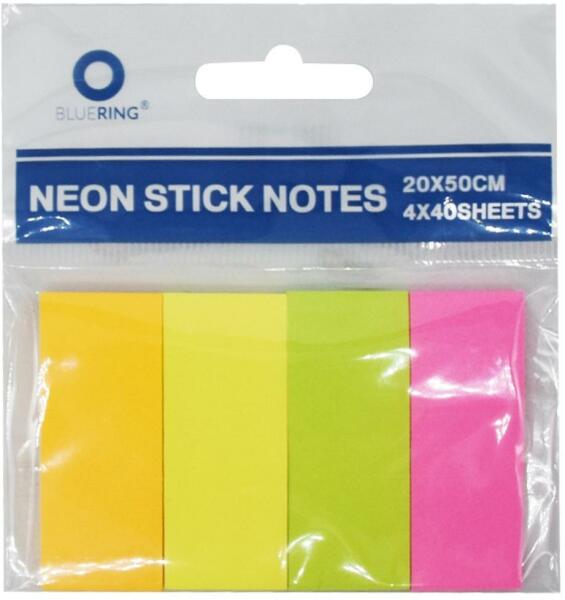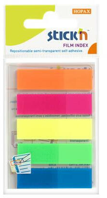 Jelölőcímke, műanyag, 5x25 lap, 45x12 mm, STICK N, neon színek Átlátszó és írható műanyag öntapadó oldaljelölők -egyszerű jelölés és rendszerezés -ragasztómaradvány nélküli használat - 5 féle élénk neon szín
