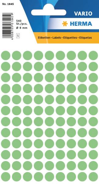 Címke mérete: 8 mm átmérőjű kör alakú jelölőcímke Herma 8 mm átmérőjű, zöld színű jelölő pötty, jelölő pont. Egy csomagban 5 lapon, összesen 540 darab jelölő címke található. A Herma 1845 cikkszámú öntapadó jelölőcímke nem nyomtatható, nem fénymásolható. Kizárólag kézzel írható, kézzel feliratozható címke. Címke mérete: 8 mm átmérőjű körcímke