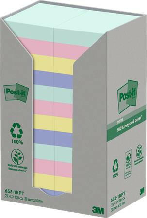 Öntapadó jegyzettömb, 38x51 mm, 24x100 lap, környezetbarát, 3M POSTIT "Nature", vegyes pasztell színek A gyártó az újrahasznosított Post-it® jegyzettömb esetében különös gondot fordított az alapanyagok környezetre gyakorolt hatására. -anyaga 100% újrahasznosított papír -PEFC RECYCLED minősítéssel rendelkeznek, és minősített, megújuló és felelős erdőgazdálkodásb
