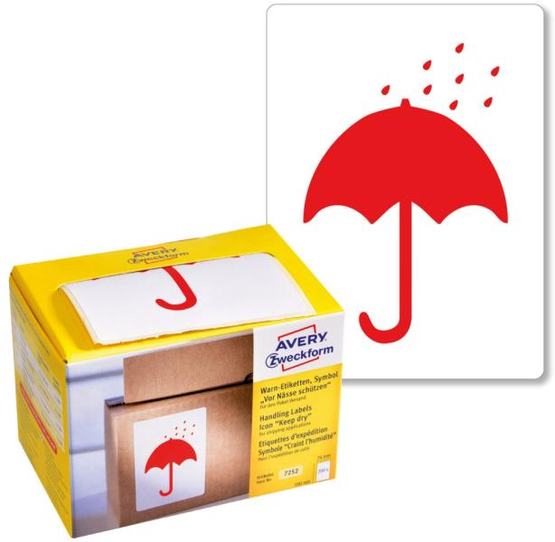Címke mérete: 74 x 100 mm Avery Zweckform 74 x 100 mm méretű, figyelemfelhívó, matt felületű, piros színű "nedvességtől óvandó" piktogrammal előre megnyomtatott öntapadós etikett címke, permanens ragasztóval, kerekített sarkokkal. Rendelési azonosító: Avery Zweckform 7252 . Az Avery Zweckform No. 7252 cikkszámú öntapadó etikett címke nem nyomtatható , nem fénymásolha