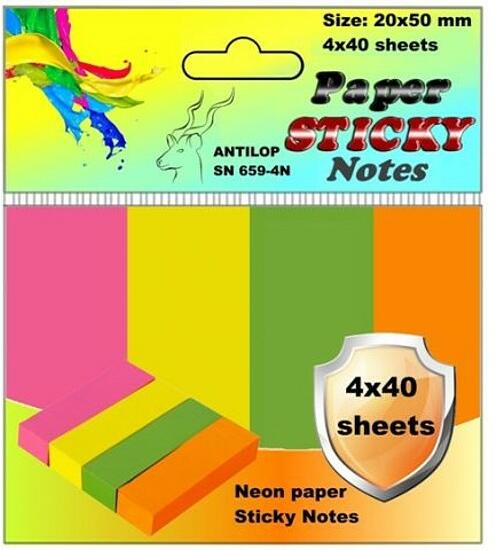 Antilop 659-4N papír, öntapadós, visszaszedhető jelölő címke, könyvek, dokumentumok oldalainak megjelölésére. Egy tömb tartalma: 40 lap neon rózsa, 40 lap neon zöld, 40 lap neon sárga, 40 lap neon narancs. Egy címke mérete: 20x50 mm