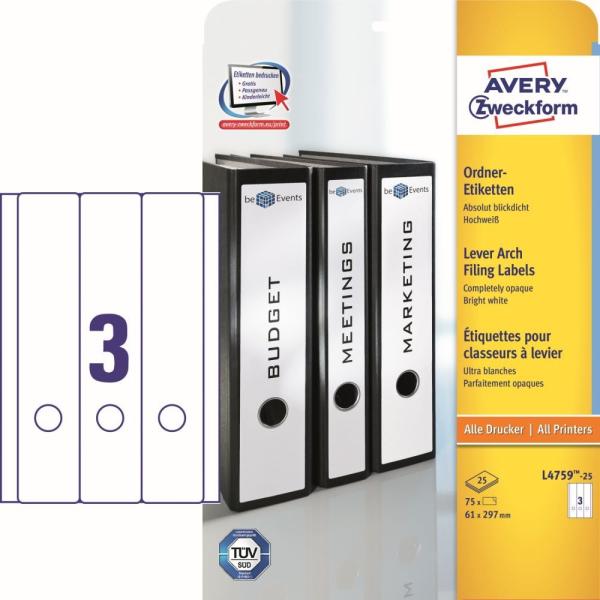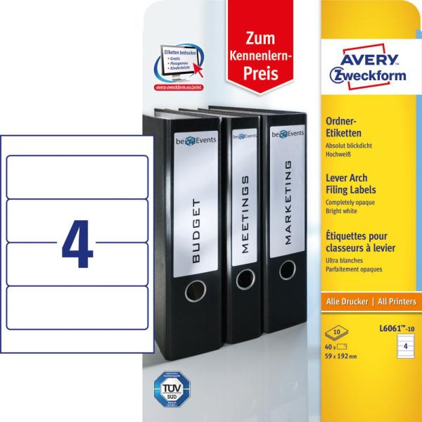 Címke mérete: 61 x 297 mm Avery Zweckform 61 x 297 mm méretű univerzális öntapadó iratrendező címke kerekített sarkokkal, különlegesen tartós tapadást biztosító ragasztóanyaggal készül. Nyomtatható: fekete-fehér és színes lézernyomtatókban, tintasugaras nyomtatókban, valamint fénymásológépekben (univerzálisan nyomtatható). Az etikett címke színes és fekete-fehér