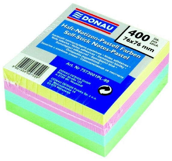 Öntapadó jegyzettömb DONAU 76x76 mm 400 lap vegyes pasztell színek Az öntapadó jegyzetlapok pasztell színei kiemelik a feljegyzéseket és üzeneteket, ezáltal az íróasztal nélkülözhetetlen kiegészítőjévé válnak. Kiváló tapadású, áthelyezhető lapok.