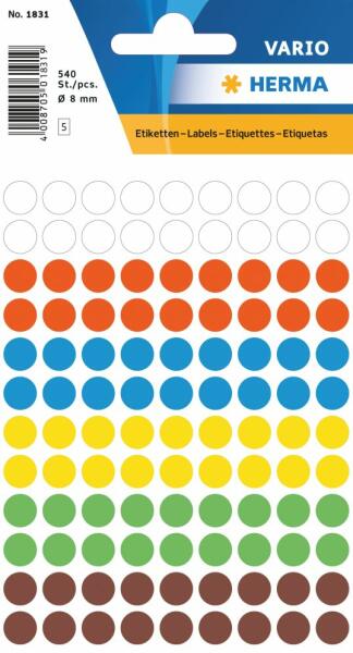 Címke mérete: 8 mm átmérőjű kör alakú jelölőcímke Herma 8 mm átmérőjű, vegyes színű jelölő pötty, jelölő pont. Egy csomagban 5 lapon, összesen 540 darab jelölő címke található. A Herma 1831 cikkszámú öntapadó jelölőcímke nem nyomtatható, nem fénymásolható. Kizárólag kézzel írható, kézzel feliratozható címke. Címke mérete: 8 mm átmérőjű körcímk