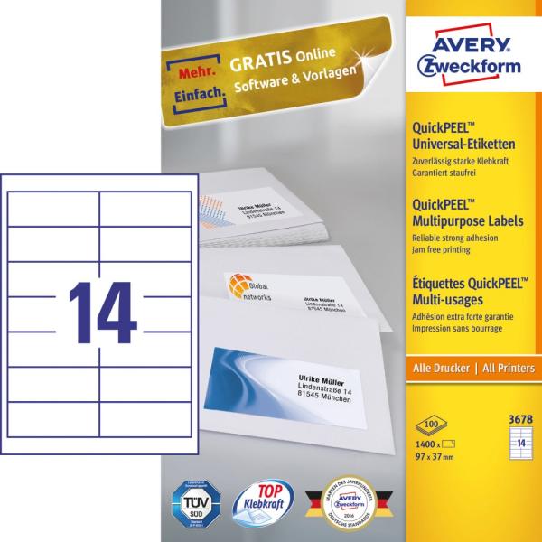 Címke mérete: 97 x 37 mm Avery Zweckform 97 x 37 mm méretű, fehér színű, matt felületű, univerzális öntapadós etikett címke, A4-es lapon, az eddigieknél erősebb tapadású ragasztóval, hegyes sarkokkal, az etikett címkék gyors leválasztását segítő QuickPEEL technológiával, valamint az új ultragrip technológiával, melynek köszönhetően a lapbehúzás rendkívül pontos
