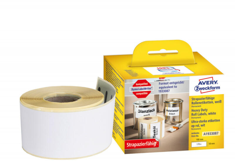 Címke mérete: 59 x 190 mm 59 x 190 mm méretű, fehér színű, matt felületű, Dymo címkenyomtatóval nyomtatható tekercses időjárásálló öntapadós etikett címke, erős, tartós ragasztóval, kerekített sarkokkal. A dobozban 1 címketekercsen összesen 170 darab nyomtatható öntapadós thermo címke található. Az Avery Zweckform öntapadós tekercses időjárásálló etikett cím