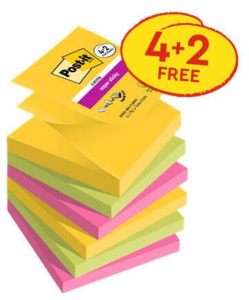 A Öntapadó jegyzettömb, Z, 76x76 mm, 4+2x90 lap, 3M POSTIT Carnival, vegyes (LPR33042SSR) A Post-it® Super Sticky öntapadós Z-jegyzetlapok erősebben és tovább tapadnak. -Post-it® eredeti jegyzettömbohöz képest kétszer erősebb tapadással rendelkeznek, így biztos lehet benne, hogy üzenete célba ér -tökéletesek a függőleges és nehezen tapadó felületek esetén -lehetővé te