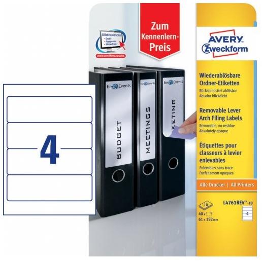 Címke mérete: 192 x 61 mm Avery Zweckform 192 x 61 mm méretű, fehér színű, matt felületű, univerzálisan nyomtatható, nagy fedőképességű öntapadós iratrendező címke, A4-es lapon, különleges (nyom nélkül eltávolítható) ragasztóanyaggal, kerekített sarkokkal, valamint az új ultragrip technológiával, melynek köszönhetően a lapbehúzás rendkívül pontos, a nyomtatás