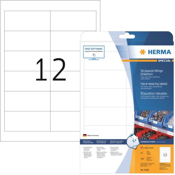Címke mérete: 97 x 42,3 mm Herma 97 x 42,3 mm méretű, fehér színű, matt felületű, időjárásálló, nyomtatható öntapadós etikett címke, A4-es lapon, extra erős, tartós ragasztóval, hegyes sarkokkal, valamint a ragasztómentes lapszéleknek és a teljesen sík címkeíveknek köszönhetően problémamentes, elakadásmentes nyomtatással. Rendelési azonosító: Herma 4692 . Nyomta