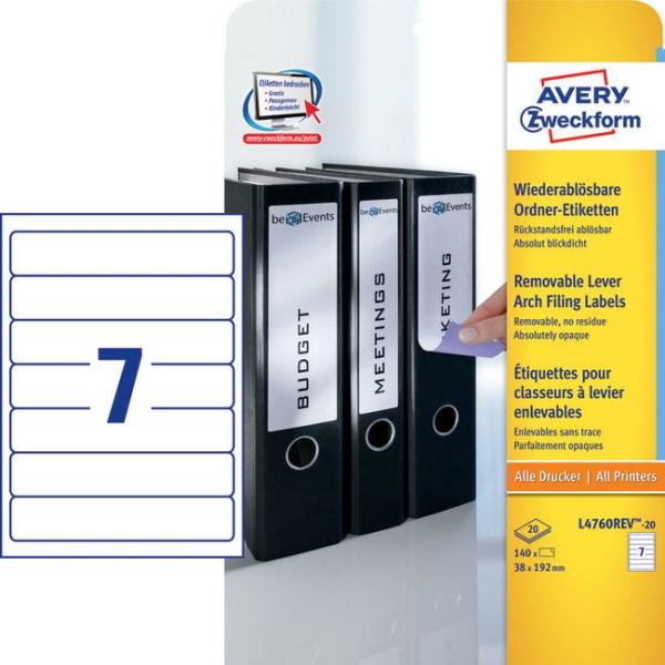 Címke mérete: 192 x 38 mm Avery Zweckform 192 x 38 mm méretű, fehér színű, matt felületű, univerzálisan nyomtatható, nagy fedőképességű öntapadós iratrendező címke, A4-es lapon, különleges (nyom nélkül eltávolítható) ragasztóanyaggal, kerekített sarkokkal, valamint az új ultragrip technológiával, melynek köszönhetően a lapbehúzás rendkívül pontos, a nyomtatás