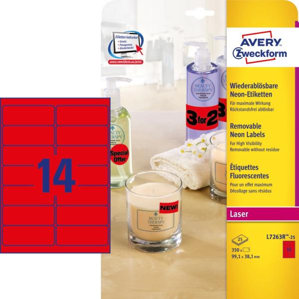 Címke mérete: 99,1 x 38,1 mm Avery Zweckform 99,1 x 38,1 mm méretű neon piros színű öntapadó etikett címke visszaszedhető ragasztóval, kerekített sarkokkal. Nyomtatható: fekete-fehér és színes lézernyomtatókban, valamint fénymásológépekben. Az etikett címke színes és fekete-fehér nyomtatókban egyaránt nyomtatható. Címke mérete: 99,1 x 38,1 mm (99,1x38,1) Címke anyag