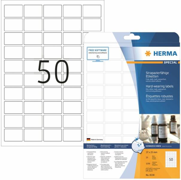 Címke mérete: 37 x 25 mm Herma 37 x 25 mm méretű, fehér színű, matt felületű, időjárásálló, nyomtatható öntapadós etikett címke, A4-es lapon, extra erős, tartós ragasztóval, kerekített sarkokkal, valamint a ragasztómentes lapszéleknek és a teljesen sík címkeíveknek köszönhetően problémamentes, elakadásmentes nyomtatással. Rendelési azonosító: Herma 8338 . Nyomt