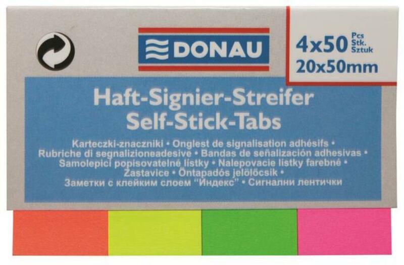 Jelölőcímke, papír, 4x50 lap, 20x50 mm, DONAU, vegyes szín (D7576) - ideális rövid üzenetekhez (telefonszámok, árak, hivatkozások stb. ) - írható felület - papír alapanyag - áthelyezhető - 4 különböző, fluoreszkáló szín a csomagban - lapok száma: 4x50