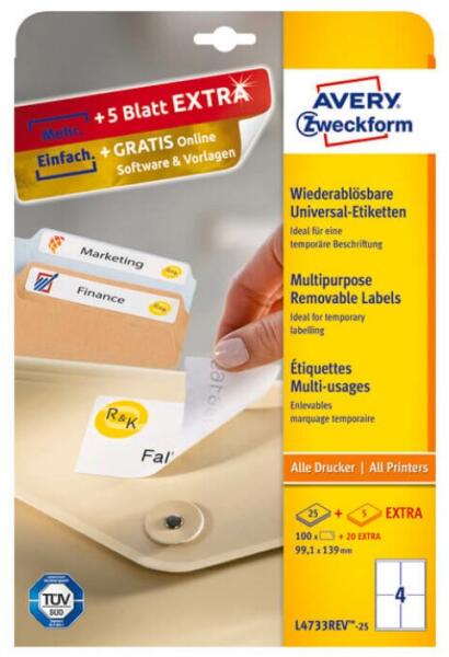 A L4733REV-25 cikkszámú Avery Zweckform öntapadós címke speciális visszaszedhető ragasztójának köszönhetően felragasztás után könnyedén visszaszedhető anélkül, hogy a felületen nyomot hagyna. Sokféle felhasználásra alkalmas, általános matt papír alapanyagú öntapadó etikett címke, visszaszedhető ragasztóval A4-es méretű lapokon. Kültéri hatásoknak nem, vagy csak