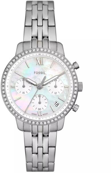A Fossil Neutra női karóra ES5357 karóra házának anyaga nemesacél, színe ezüst, a szíjának anyaga nemesacél és a színe ezüst. Az óratok átmérője 36 mm, alakja kerek. A karóra üvege kristály (nehezen karcolható), szerkezete kvarc és vízállósága 5 atm (50m) (erősen cseppálló).