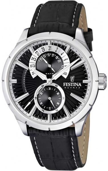 Az elegáns, időtlen megjelenésű Festina órák ideális kiegészítői mind a társasági, mind az alkalmi öltözékeknek. Ez a kerek, acél házzal ellátott óra kvarc (elemmel működő) mechanizmussal működik, 24 órás számlap és dátum kijelzéssel. A fekete számlapon az időt ezüstszínű indexek mutatják. A számlapot lapos ásványi üveg borítja. Az 50M vízállóság biztos