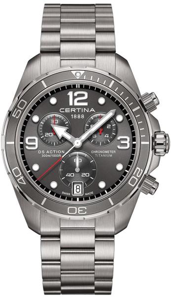 Certina DS ACTION Chrono Gent férfi karóra C032.434. 44.087. 00 egy kerek formájú, szürke színű titánium óratokkal, szürke analóg számlappal és szürke titánium szíjjal rendelkező sportos Certina karóra. Az óra elemmel működő kvarc szerkezettel és 20 ATM vízállósággal rendelkezik, tehát búvárkodásra megfelelő. Ez a fantasztikus óra most 356915 áron megrendelhető w