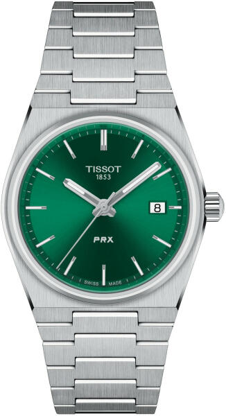 Tissot PRX 35mm unisex karóra T137.210. 11.081. 00 egy hordó formájú, ezüst színű nemesacél óratokkal, zöld analóg számlappal és ezüst nemesacél szíjjal rendelkező divatos Tissot karóra. Az óra elemmel működő kvarc szerkezettel és 10 ATM vízállósággal rendelkezik, tehát fürdésre, úszásra használható. Ez a fantasztikus óra most 169900 áron megrendelhető webshopu
