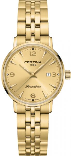 Certina DS CAIMANO Lady női karóra C035.210. 33.367. 00 egy kerek formájú, arany színű nemesacél óratokkal, arany analóg számlappal és arany nemesacél szíjjal rendelkező divatos Certina karóra. Az óra elemmel működő kvarc szerkezettel és 10 ATM vízállósággal rendelkezik, tehát fürdésre, úszásra használható. Ez a fantasztikus óra most 194310 áron megrendelhető webs