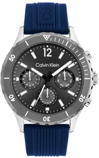 Calvin Klein férfi karóra típusa 25200120. A CALVIN KLEIN Sport For Him 25200120 egy funkcionális és vonzó férfi karóra a Sport For Him kollekcióból. A tok rozsdamentes acélból készült, ami az elem kiváló minőségét jelenti, a szürke számlap pedig egyedi megjelenést kölcsönöz az órának. Ez a modell 30 méteres vízállósággal rendelkezik – olyan esetekben is viselhet