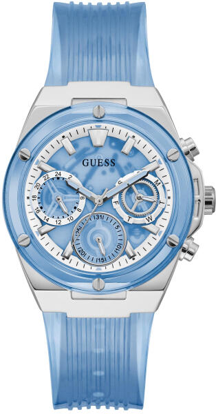 Eredeti Doboz, Pontos óraszerkezet , Kiváló minőségű anyagok, kifinomult tervezés 2év Magyar jótállás, 15 napos pénzvisszafizetés Guess Athena női óra karóra GW0409L1 Multifunctional nemesacél tok, ezüst bevonat / kék, csiszolt szilikon szíj, kék / átlátszó, tűzött szij Quartz szerkezet, elemes naptári nap kijelző, dátumkijelzés, 24 órás kijelző 50 méter vízáll