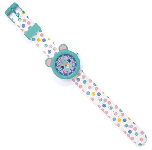 Djeco gyerek karóra leírása:Ez a gyerek karóra gyorsan a gyerkőcök kedvencévé válik. Fehér alapon színes pöttyös óraszíja van és a számlapot egy vidám kisegér feje díszíti. Igazán divatos karóra kifejezetten a kicsik számára tervezve és készítve. A karóra szíja textilből készül, állítható. Az óra hagyományos számlappal készül, ami nagy segítséget jelent a