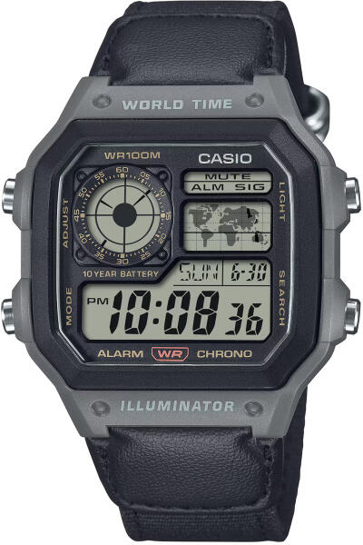 Casio Collection férfi karóra típusa AE-1200WHUB-8AVEF. Merész stílus, praktikus funkcionalitás – a multifunkcionális digitális óra új dizájnja, amelyet a kütyük szeretete ihletett. A bal felső sarokban lévő digitális tárcsa folyamatosan megjeleníti az otthoni időt, még akkor is, ha olyan funkciókat használ, mint a stopper. A jobb felső sarokban lévő világtérkép szin