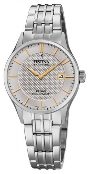 Elegáns női karóra Festina átlátszó számlapjával ideális kiegészítője mind a társasági, mind az alkalmi öltözéknek. Ez a kerek, acél tokkal ellátotttársadalmi óra kvarc (elemes)óraművel működik, a 3 órás pozícióban dátumkijelzővel. Az időt az ezüst számlapon arany indexek mutatják. A számlapot lapos zafírüveg borítja, és a 100 méteres vízállóságnak kös
