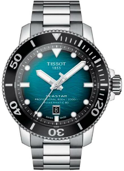 Tissot Seastar 2000 Professional Powermatic 80 férfi karóra T120.607. 11.041. 00 egy kerek formájú, ezüst színű nemesacél óratokkal, kék analóg számlappal és ezüst nemesacél szíjjal rendelkező sportos Tissot karóra. Az óra mechanikus (automata) szerkezettel és 60 ATM vízállósággal rendelkezik, tehát búvárkodásra megfelelő. Ez a fantasztikus óra most 505900 áron megre