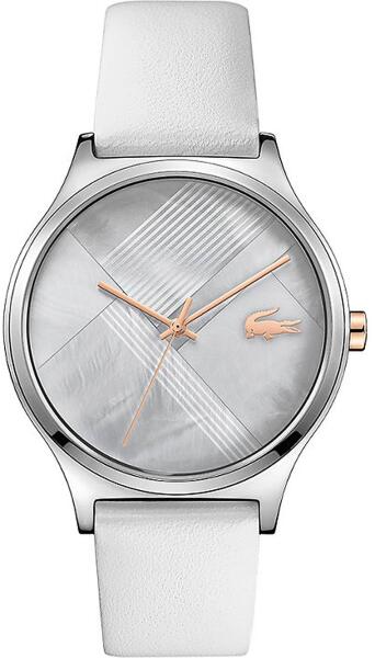 Lacoste Nikita női karóra 2001146 egy kerek formájú, ezüst színű nemesacél óratokkal, gyöngyház analóg számlappal és fehér valódi bőr szíjjal rendelkező divatos Lacoste karóra. Az óra elemmel működő kvarc szerkezettel és 3 ATM vízállósággal rendelkezik, tehát cseppálló. Ez a fantasztikus óra most 32340 áron megrendelhető webshopunkban, melyre 24 hónap garanciát