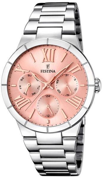 Festina 16716/3 női karóra a MADEMOISELLE kollekcióból. A Festina a mechanikus órák aranykorában a kiváló minőség, az innováció és az órakészítői kézművesség terén szerzett elismerést versenytársainak. Szó szerint bele fogsz szeretni ennek a modellnek a számlapjába a jellegzetes római számokért, a rózsaszín kijelzőért, amely tökéletesen kiemeli az egész megjele