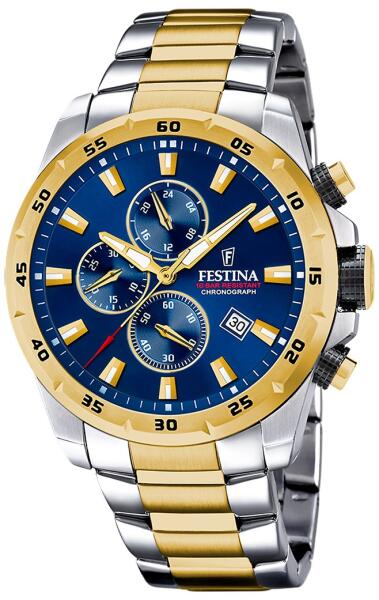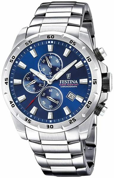 A Festina 20463/2 férfi karórát eredeti sportos stílusa jellemzi, fém szíjjal. Ez egy eredeti óra, amely sok modern férfinak tetszeni fog. Az óra ezüst színű kialakítása könnyen kombinálható különböző öltözetekkel. A sötétkék kijelzőn három precízen megmunkált kronográf található. A számlapon számjegyek helyett egyszerű indexek találhatók. A csuklós fémszíj