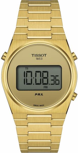 Tissot PRX Digital 35 mm unisex karóra T137.263. 33.020. 00 egy hordó alakú, arany színű nemesacél óratokkal, arany digitális számlappal és arany nemesacél szíjjal rendelkező divatos Tissot karóra. Az óra elemmel működő kvarc szerkezettel és 10 ATM vízállósággal rendelkezik, tehát fürdésre, úszásra használható. Ez a fantasztikus óra most 195900 áron megrendelhető w
