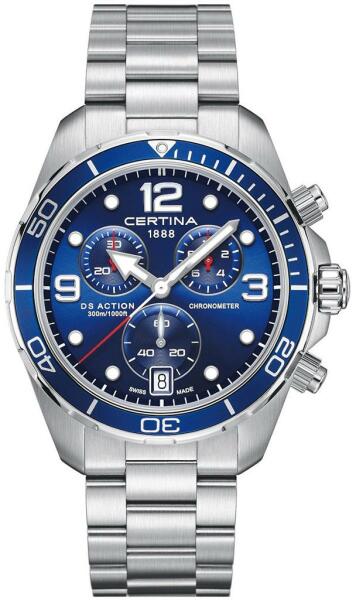 Certina DS ACTION Chrono Gent férfi karóra C032.434. 11.047. 00 egy kerek formájú, ezüst színű nemesacél óratokkal, kék analóg számlappal és ezüst nemesacél szíjjal rendelkező sportos Certina karóra. Az óra elemmel működő kvarc szerkezettel és 20 ATM vízállósággal rendelkezik, tehát búvárkodásra megfelelő. Ez a fantasztikus óra most 297415 áron megrendelhető webs