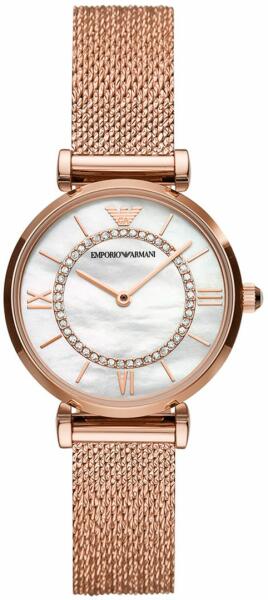 Armani Emporio női karóra rozsdamentes acél szíjjal. Analóg kijelzővel ellátott, letisztult és finom eleganciájának köszönhetően divatos megjelenést kölcsönöz viselőjének. Hétköznapokon, de akár jeles alkalmakkor is viselhető, jól kombinálható különböző ruhadarabokkal. Jellemzői: - Számlap átmérője: 32 mm - Szíj anyaga: rozsdamentes acél - Óraház anyaga: rozs