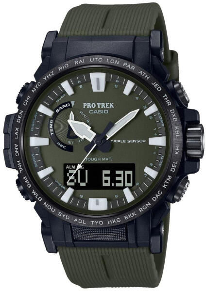 Info: Bemutatjuk az új PRW61-et, az első Casio órát, amely megújuló szerves anyagokból származó biomassza műanyagból készül. 10 BAR nyomásig vízálló: Az óra 10 BAR nyomásig ellenáll a víz nyomásának. Úszni, fürdeni nyugodtan lehet az órában INVERZ SZÁMLAP: Az óra digitális kijelzőjén a számok sötét alapon inverz kijelzéssel jelennek meg. Rádiójel vezérlés: E