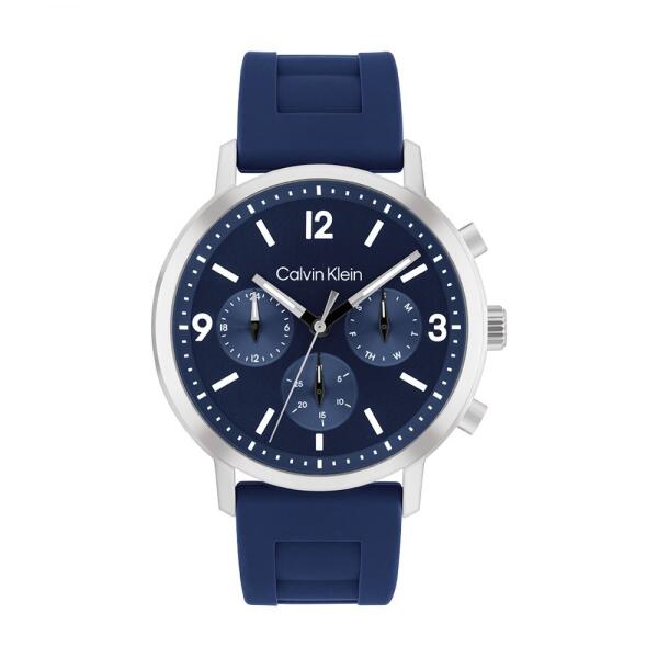 Calvin Klein Gauge férfi karóra 25200460. Aképen láthatóCalvin Kleinférfi karóra tok anyaga nemesacél, színe ezüst, a szíj anyaga szilikon és a színe kék. A z óratok átmérője 44mm, alakja kerek. Akaróra üvege kristály (nehezen karcolható), szerkezete kvarc és vízállósága 3 atm (30m) (cseppmentes). A z óra hibátlan állapotban, gyári dobozával együtt kerül csomagol
