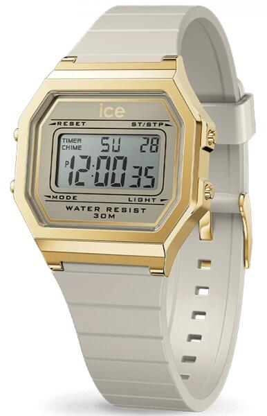Az Ice Watch Digit Retro Wind női karóra 32mm 022066 karóra házának anyaga Műanyag, színe Arany, a szíjának anyaga Szilikon és a színe Szürke. Az óratok átmérője 32 mm, alakja Négyszögű. A karóra üvege Kristály (nehezen karcolható), szerkezete Kvarc és vízállósága 3 atm (30m) (cseppmentes).